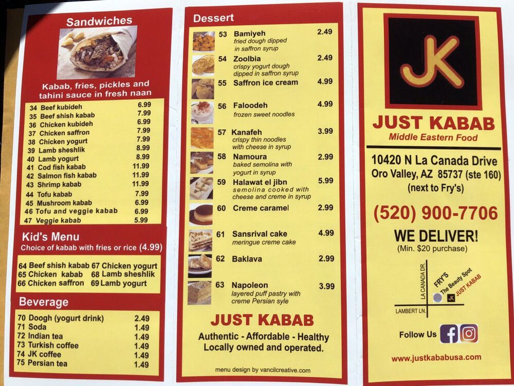 Welcome to Just Kabab, a delightful oasis of Middle Eastern cuisine located in Oro Valley, AZ. Specializing in flavorful kebabs and authentic appetizers, this charming eatery offers a menu that is sure to please everyone. Start your culinary journey with the Falafel Plate or the creamy Hummus, both served with freshly baked bread.